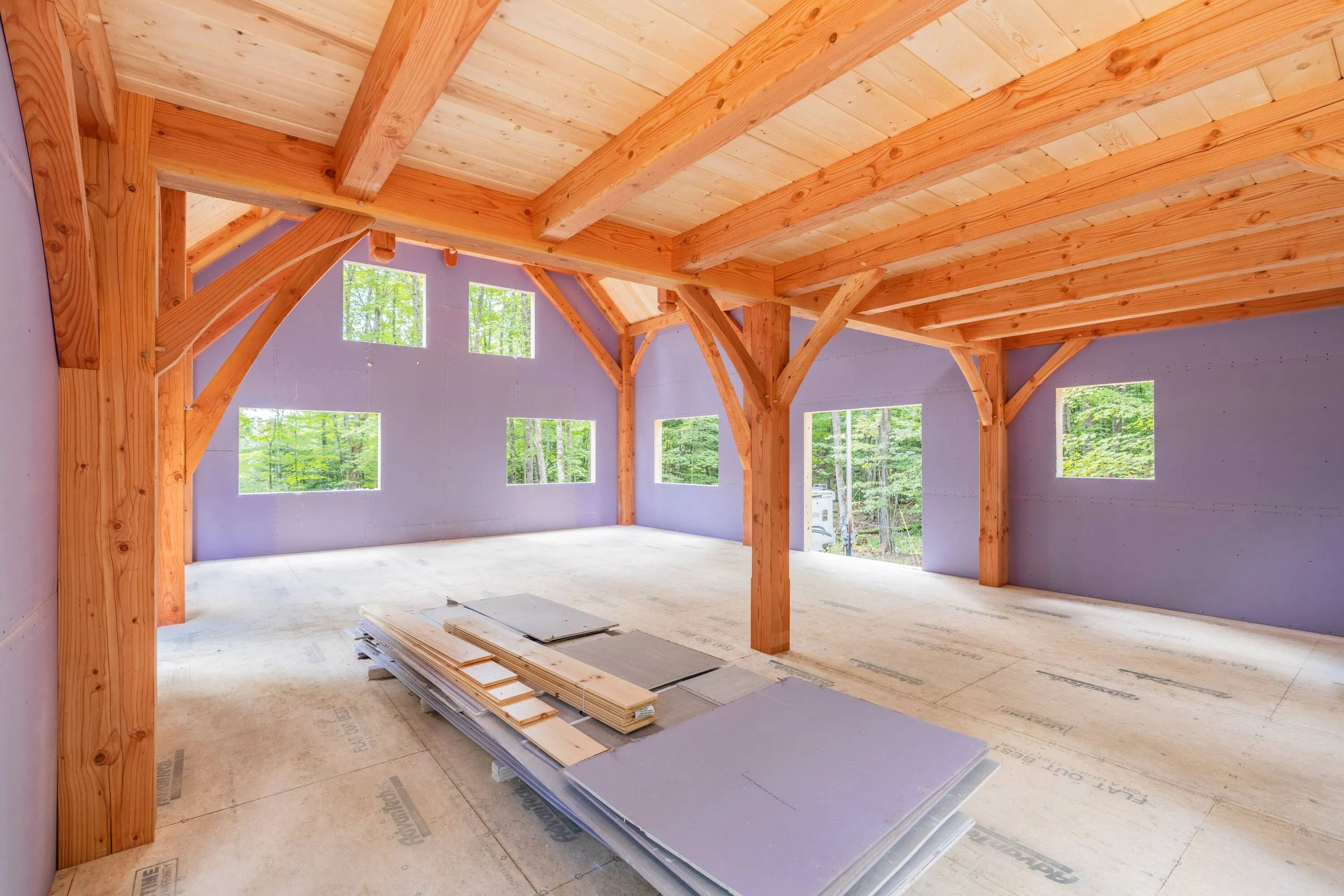 With timber frame homes, the posts and beams do all the structural work, removing the need for interior load-bearing walls. This gives you the flexibility to design your interior however you’d like—wide open spaces, sweeping lofts, walls wherever you want them (or not at all). The trade-off? Your design will need to be finalized before construction begins.